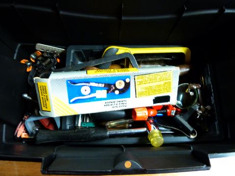 A tool box and contents to include model making screwdrivers, spanners, clamps etc
