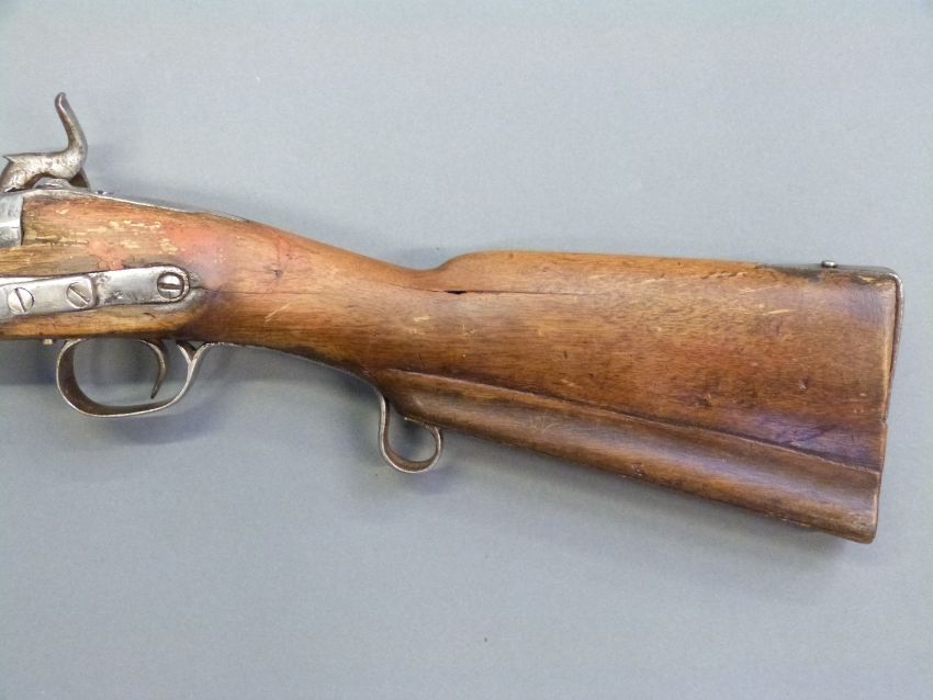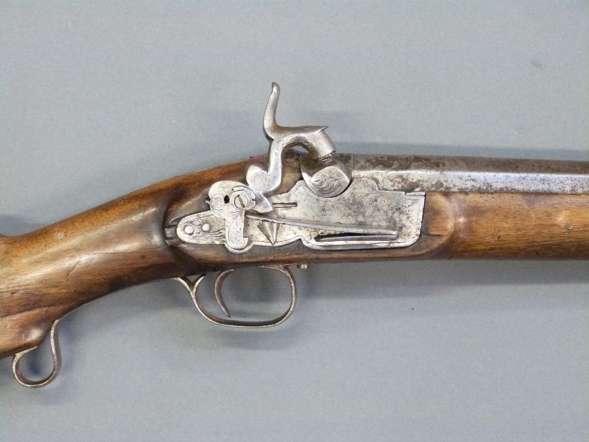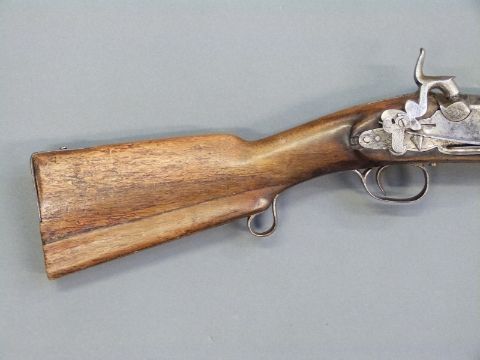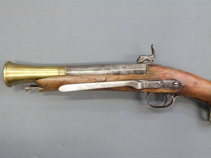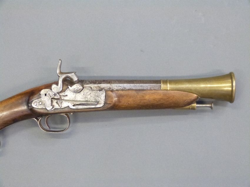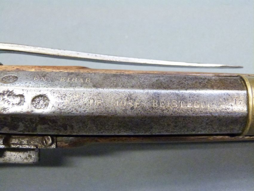 Jose Beistegui Naval percussion hammer action blunderbuss with visible Roman type lock, steel mounts, trigger guard, ramrod and belt hook, engraved lock and hammer and 9 inch octagonal barrel with flared brass muzzle, stamped with proof marks and silver inlay 'En Eibar G A De Jose Beistegui', c1780, overall length 53cm.
