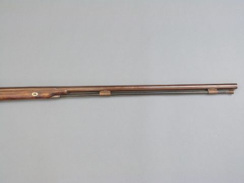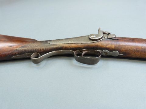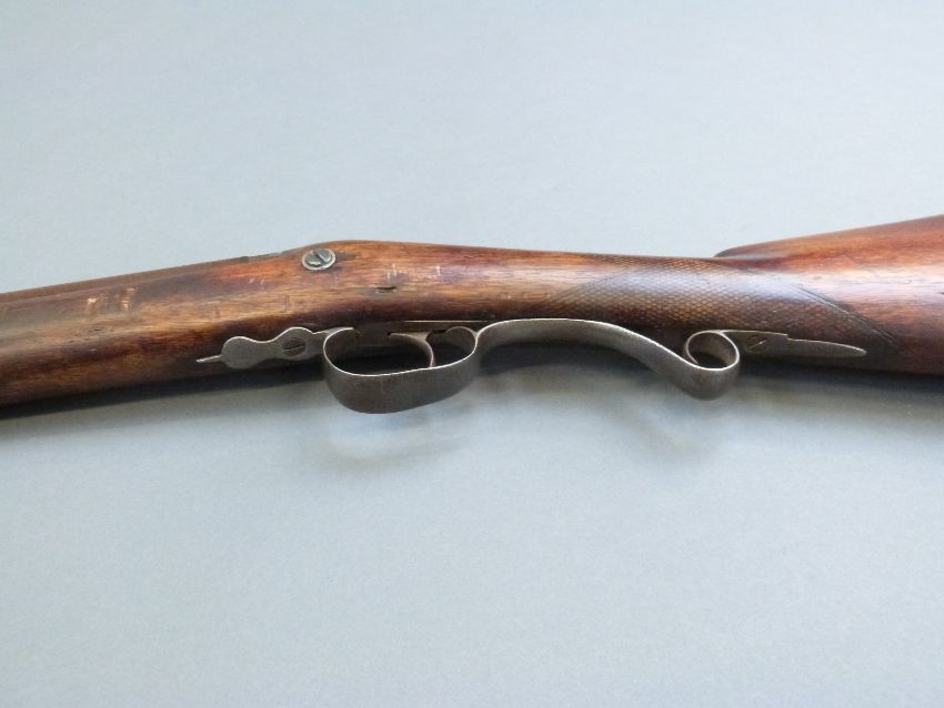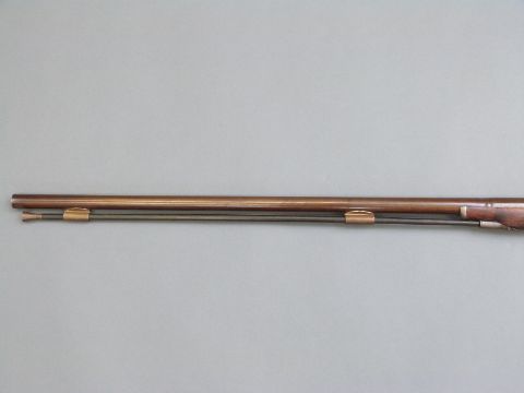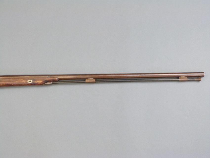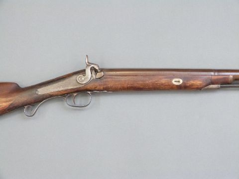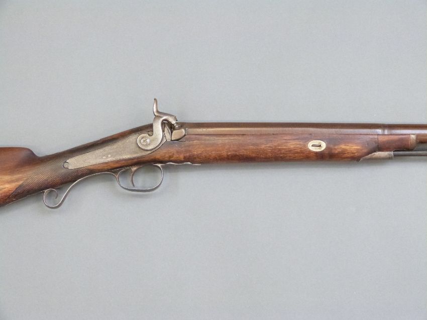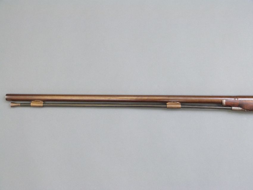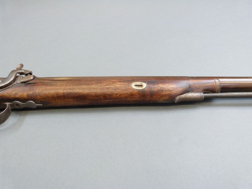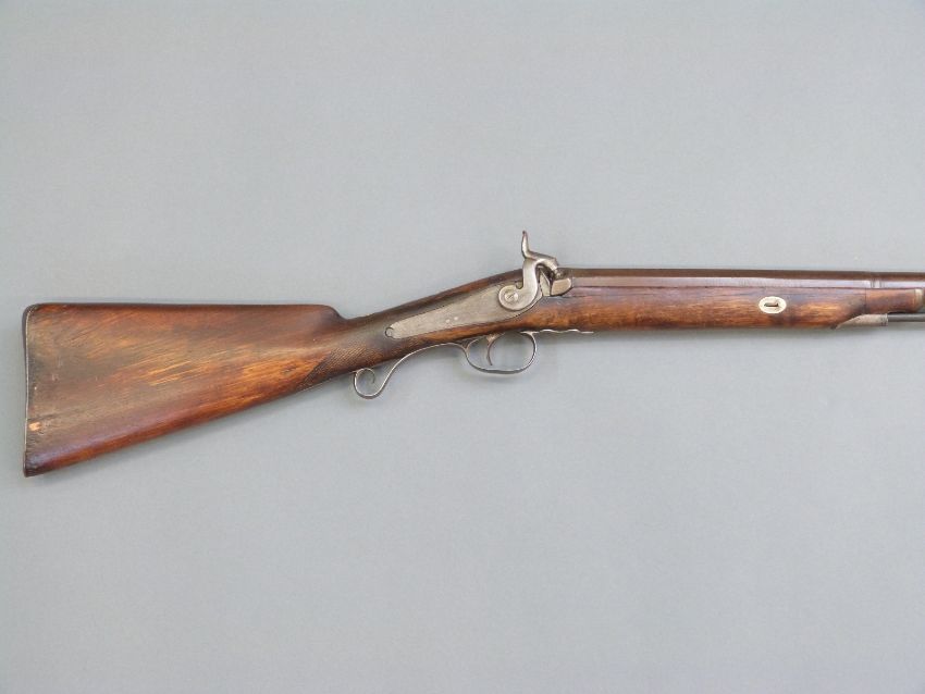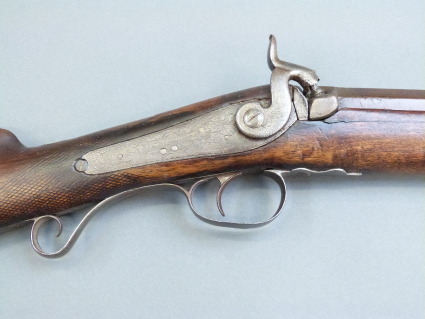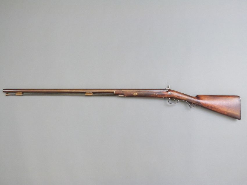 Durs Egg percussion hammer action gun with engraved lock named D Egg, scrolling trigger guard, chequered grip, brass tipped wooden ram-rod and 35 inch part octagonal Damascus barrels, overall length 130.5cm.