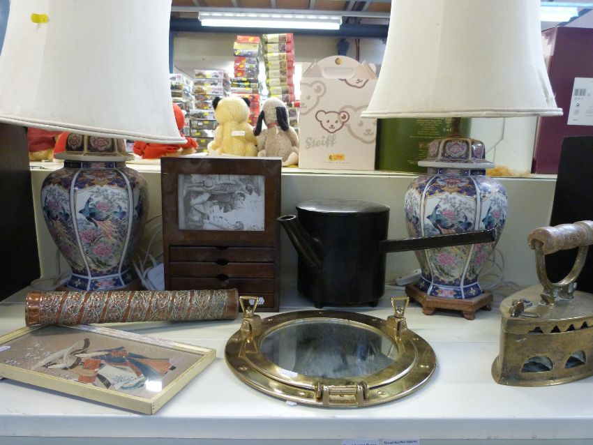 A collection of brass & wood to include a turned wood collar box, lacquer pourer, pair of Chinese style lamps etc.
