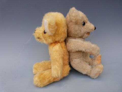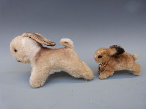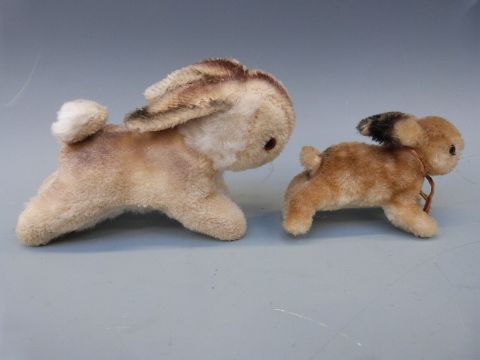Six vintage soft toys including two rabbits