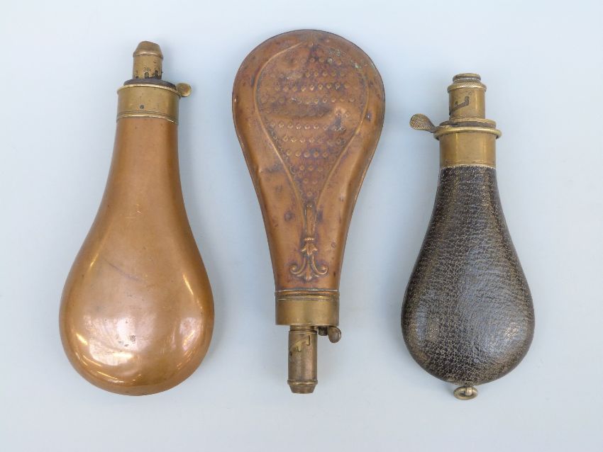 Three G & J W Hawksley of Sheffield powder flasks one with embossed decoration, the other leather covered with single suspension loop, largest 20cm long.