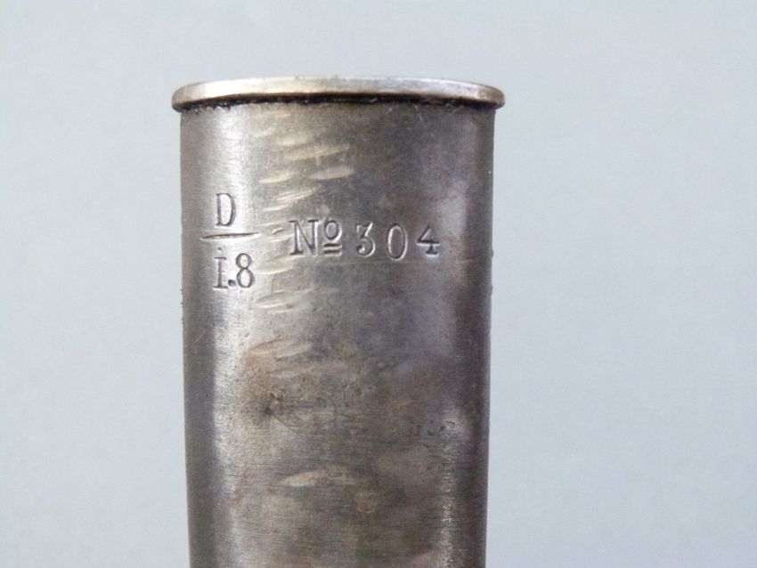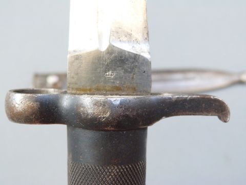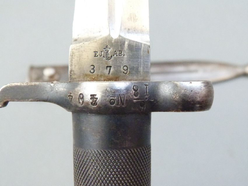 WWI Swedish 1896 pattern bayonet marked EJ.AB 379 to blade and number 404 to hilt, in steel scabbard numbered 304, blade length 21cm