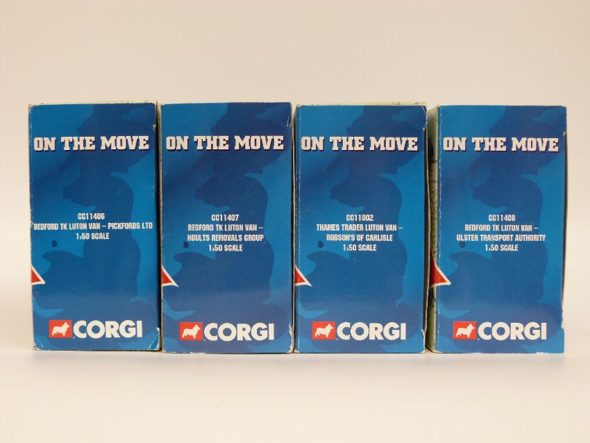 Four Corgi On the Move limited edition diecast model vans, three Bedford TK Luton Vans Pickfords CC11406, Hoults CC11407 and Ulster Transport CC11408 and Thomas Trader Luton Van Robson's of Carlisle CC11002, all in original boxes
