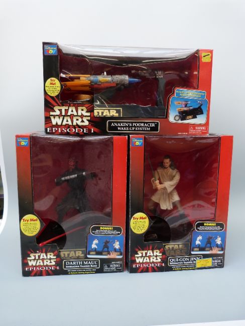 Three Think Way Star Wars models Qui-Gon Jinn and Darth Maul Interactive Talking Banks and Anakin's Podracer Wake-up system, all in original boxes