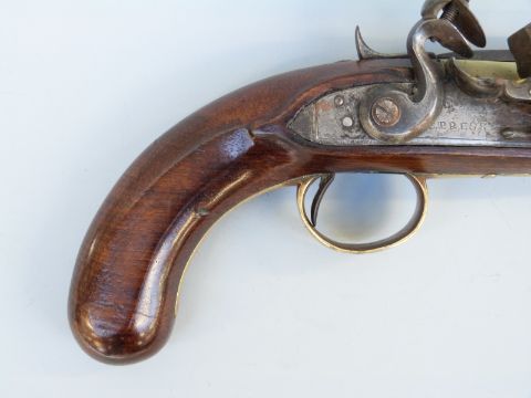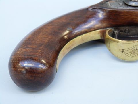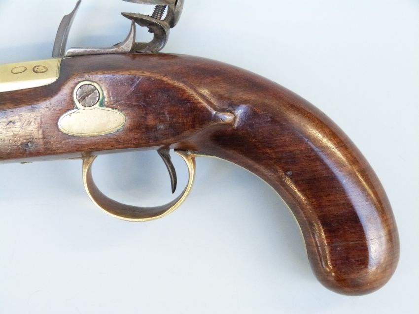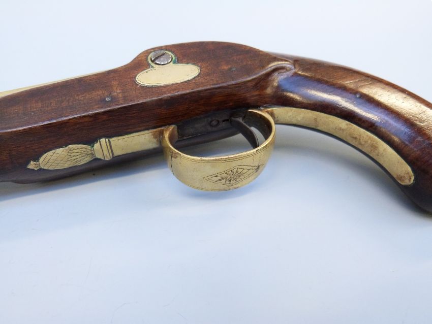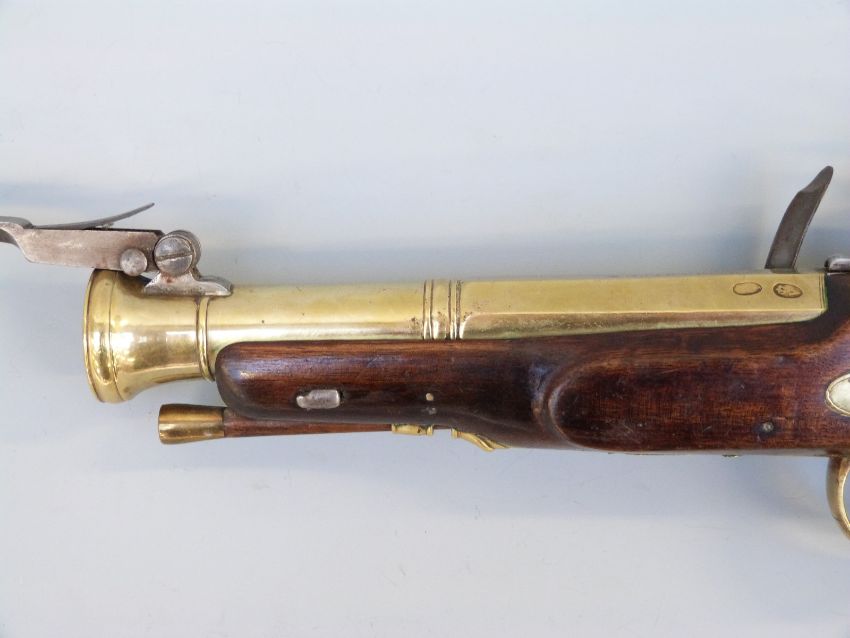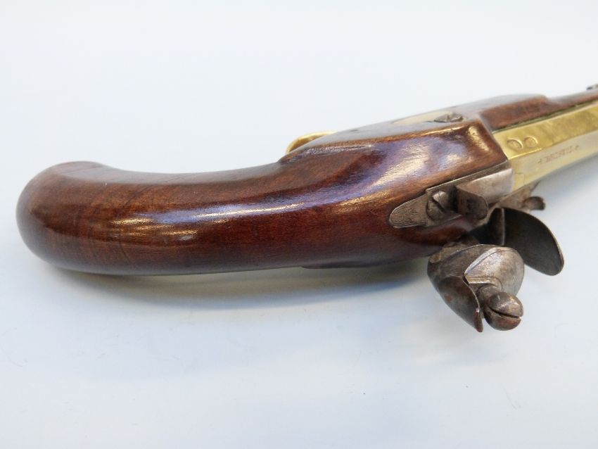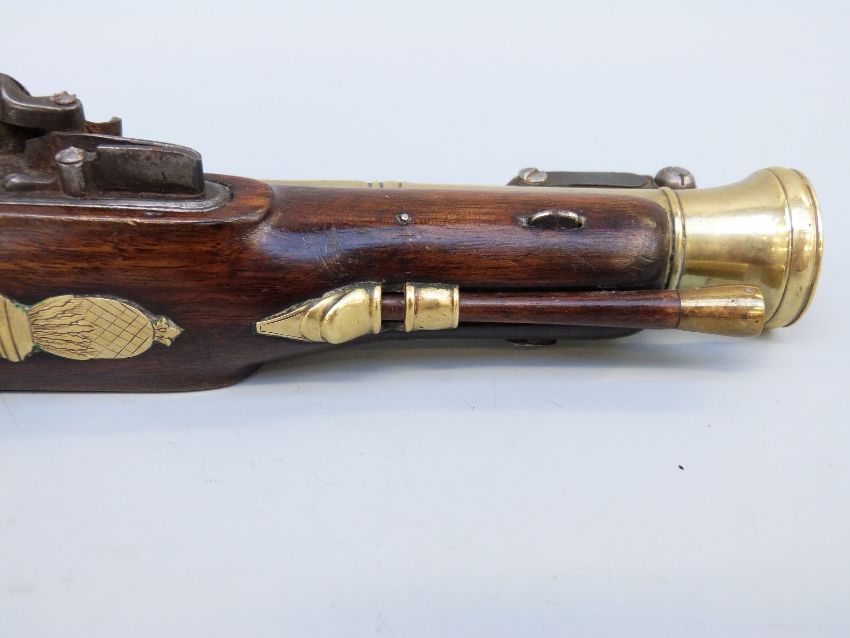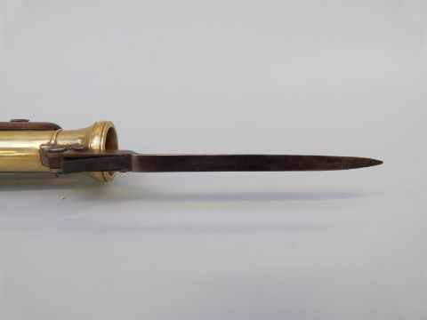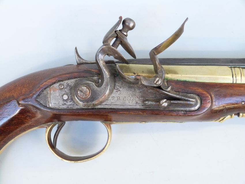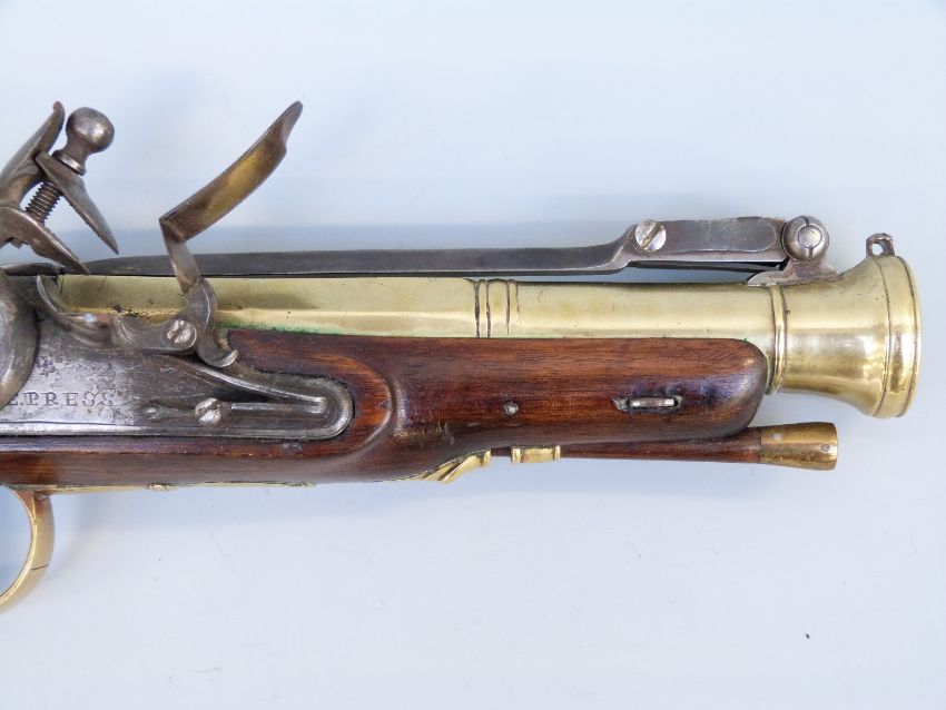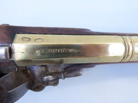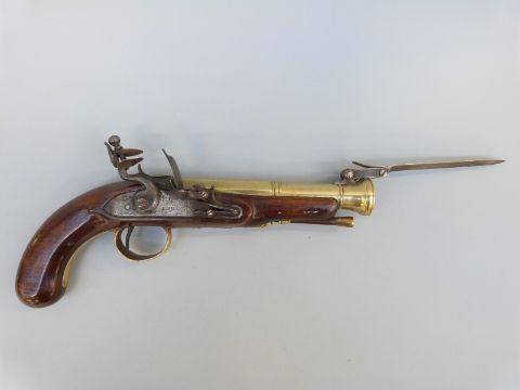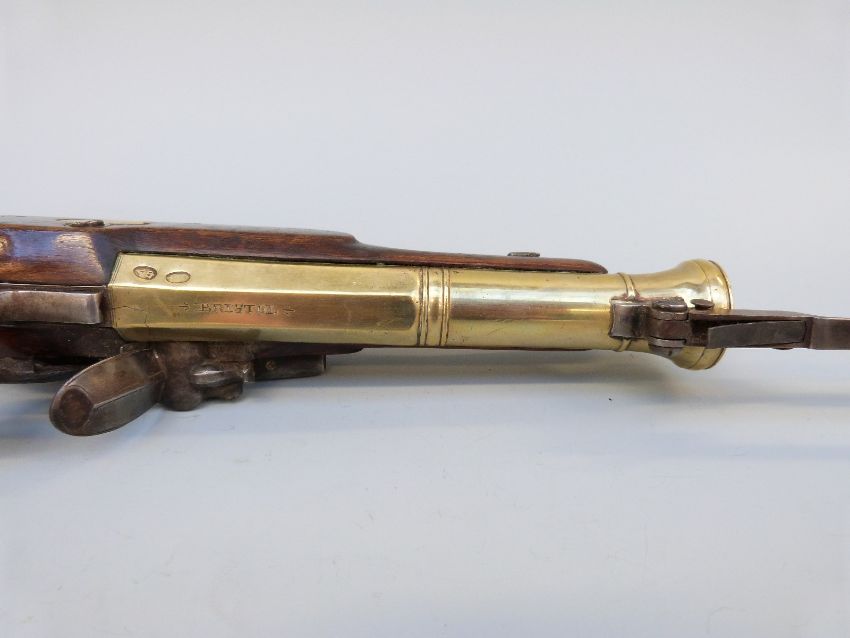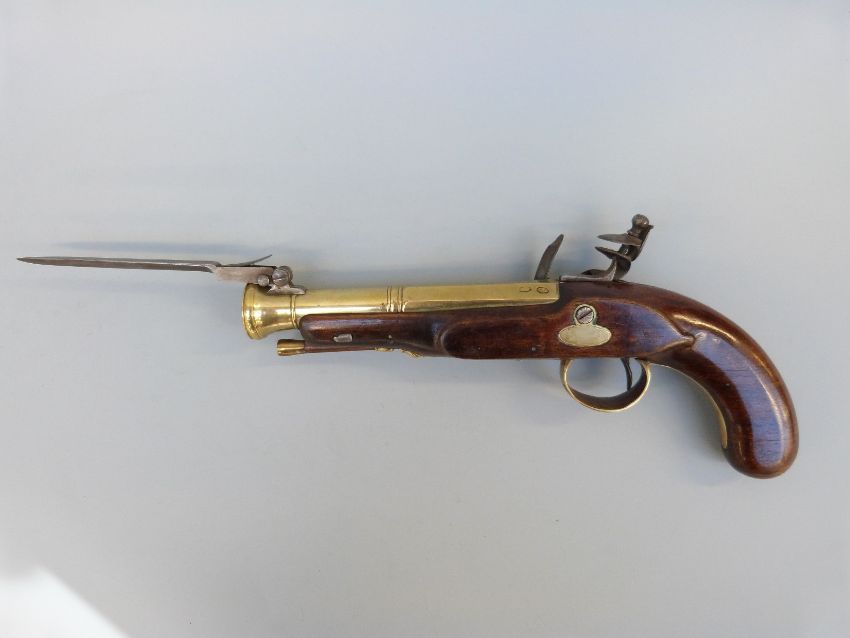 E Press of Bristol flintlock hammer action officer's boarding pistol or blunderbuss pistol with 5.5 inch sprung bayonet, named and line engraved lock, engraved and pineapple finialled trigger guard, brass mounts, brass tipped wooden ram-rod and 6 inch part octagonal flared brass barrel engraved 'Bristol' and stamped with crown over V and crown over G proof marks, overall length 30cm.