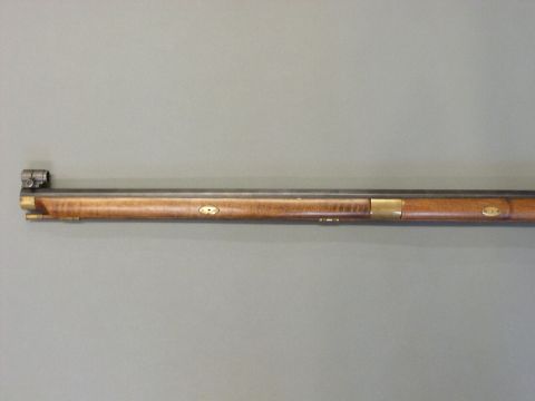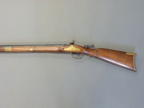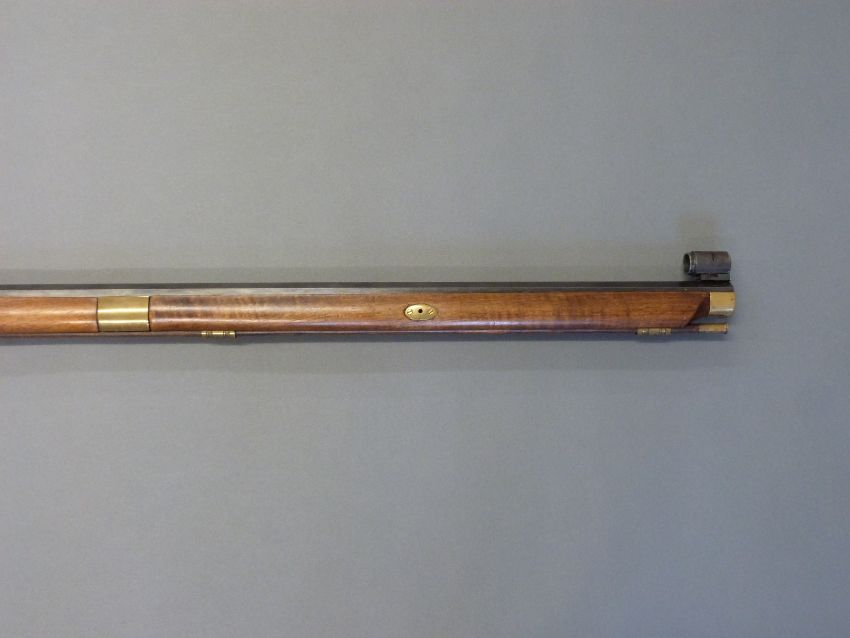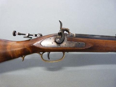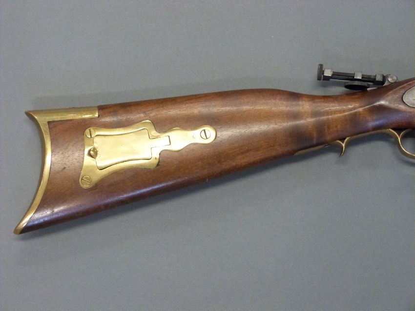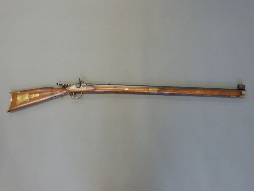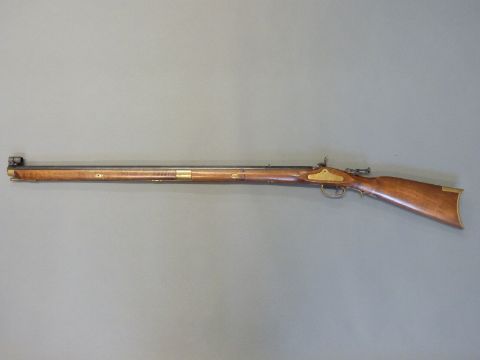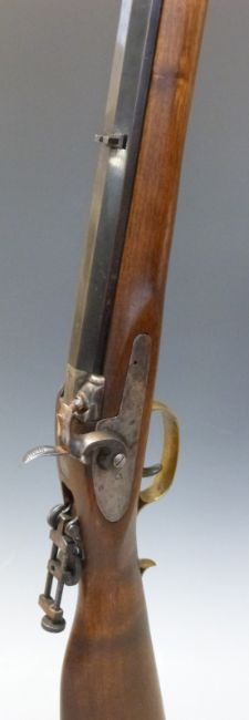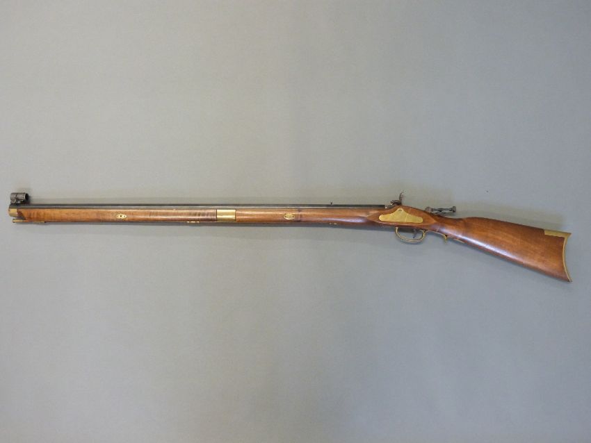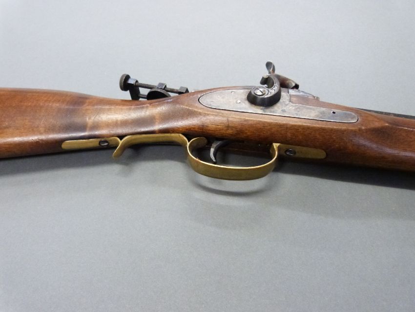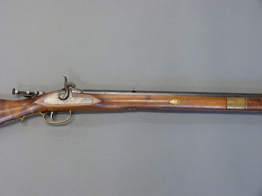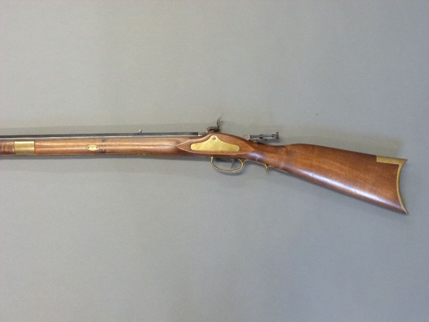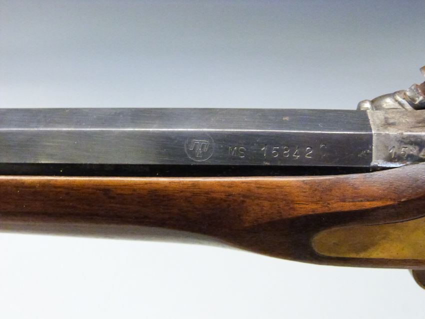 Spanish .451 Kentucky style gun with engraved hammer, brass butt plate, trigger guard and mounts, storage compartment to the stock, brass tipped wooden ram-rod, adjustable rear sights and 33 inch smooth bored octagonal barrel, overall length 123cm, serial number 158420. PLEASE NOTE THAT A VALID RELEVANT FIREARMS/SHOTGUN CERTIFICATE IS REQUIRED TO HANDLE/PURCHASE THIS ITEM.