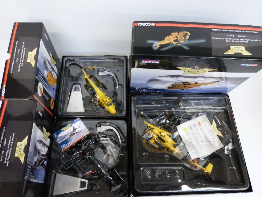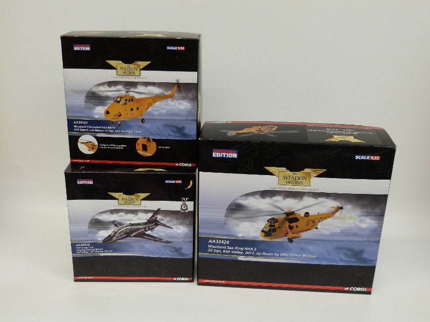 Three Corgi The Aviation Archive limited and special edition 1:72 scale diecast model aircraft - Westland Sea King HAR.3 22Sqn, RAF Valley, 2011, As flown by Prince William AA33420, Westland Whirlwind HAR Mk10 AA39101 and BAe Hawk T1A AA36010, all in original boxes