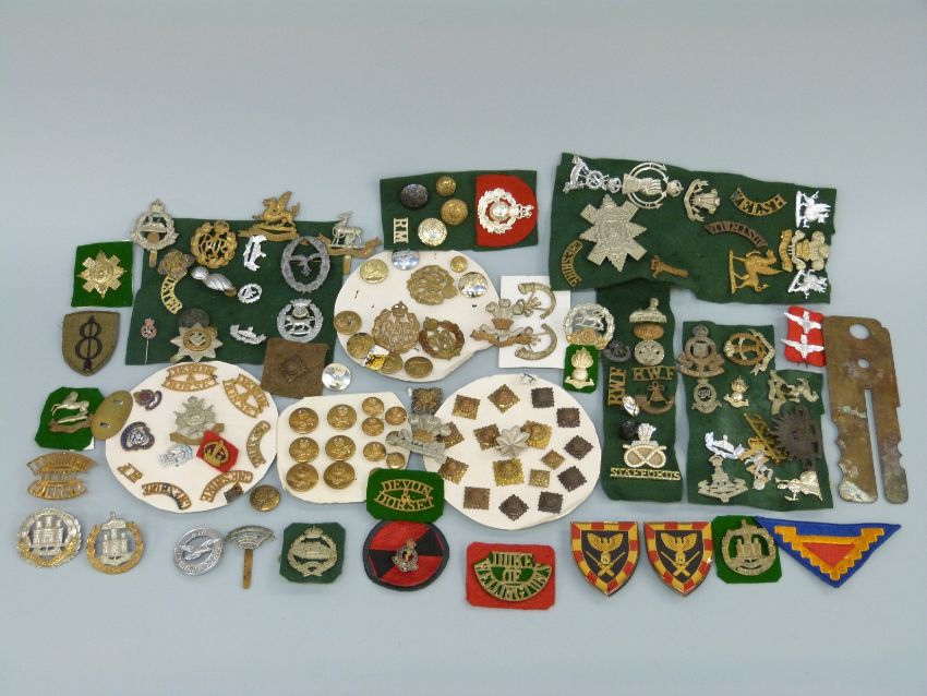 Military badges including Dorsetshire Regiment, Brecknochshire Regiment, Devonshire Regiment, King's Regiment, Middlesex, 11th Hussars, Gloucestershire Regiment etc, over 40 in all, together with RAF badges and buttons