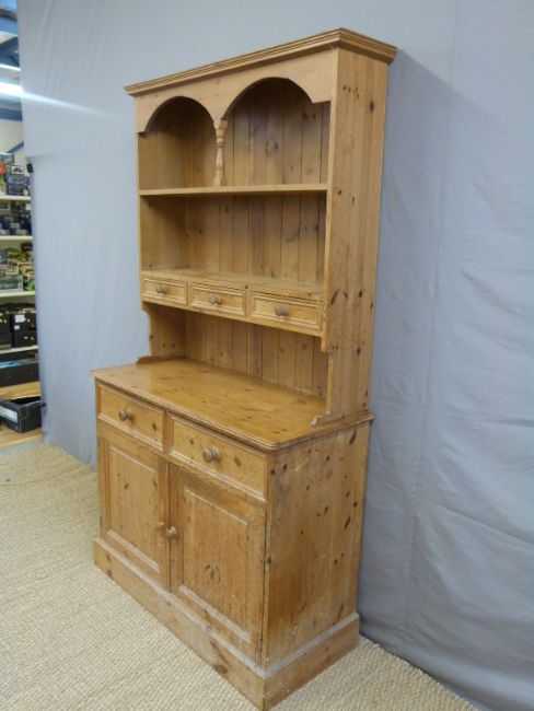A pine dresser with an arrangement of cupboards, drawers and cubbyholes (H197 x W107 x D46cm)