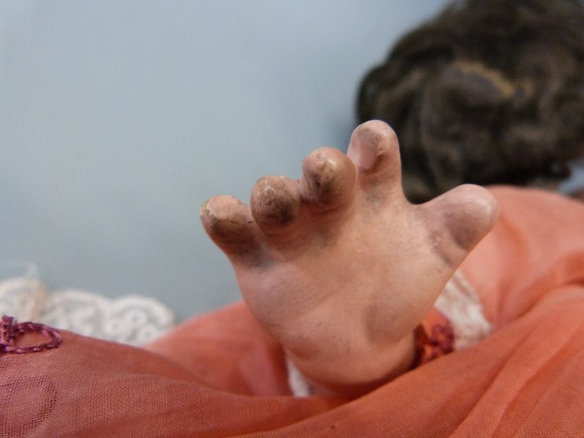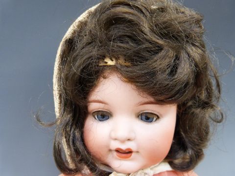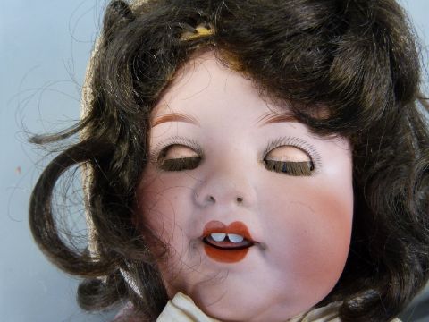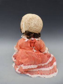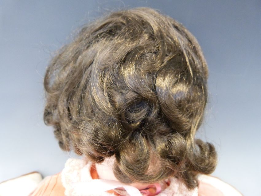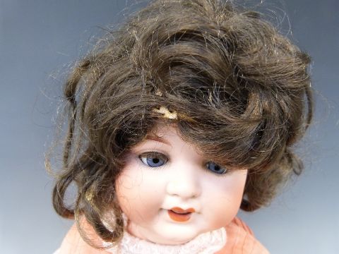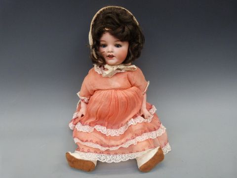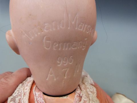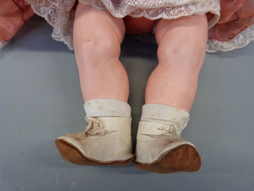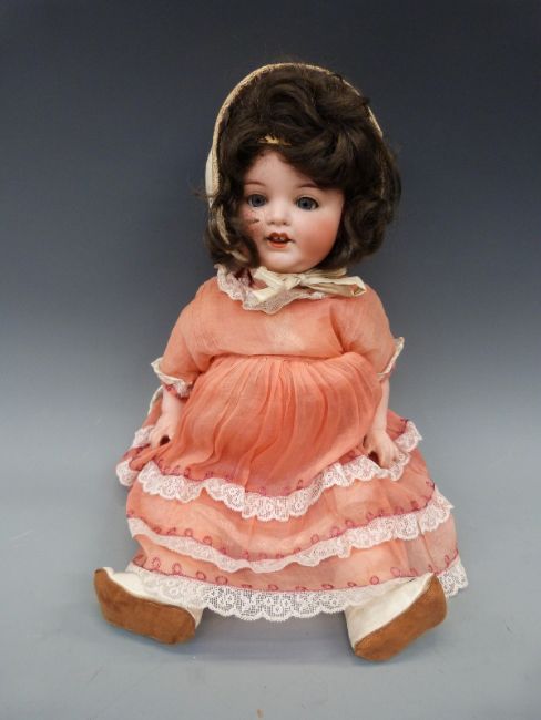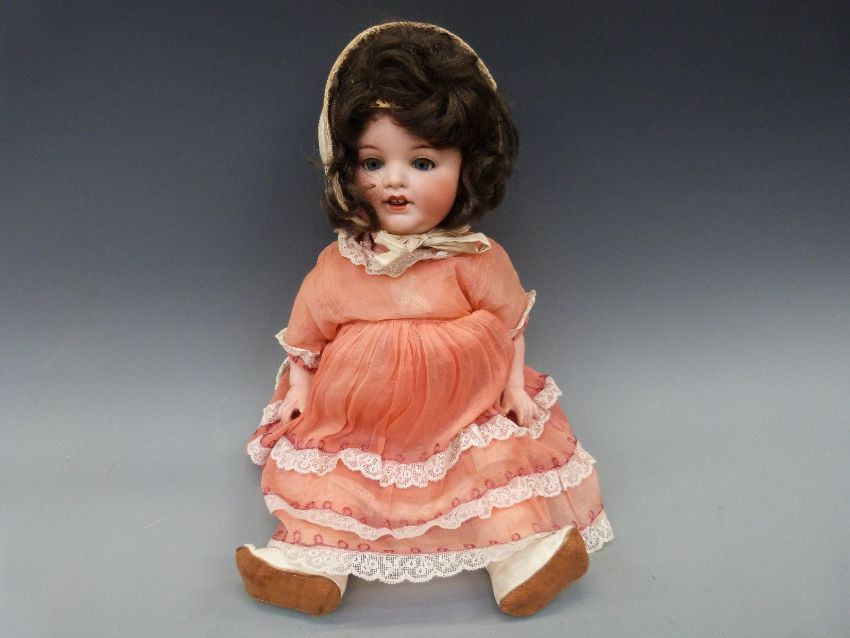 An Armand Marseille bisque headed girl doll with open mouth, weighted blue eyes, in a pink organza dress and white kid shoes, marked 'Germany 996 A.7.M', approximately 50cm high