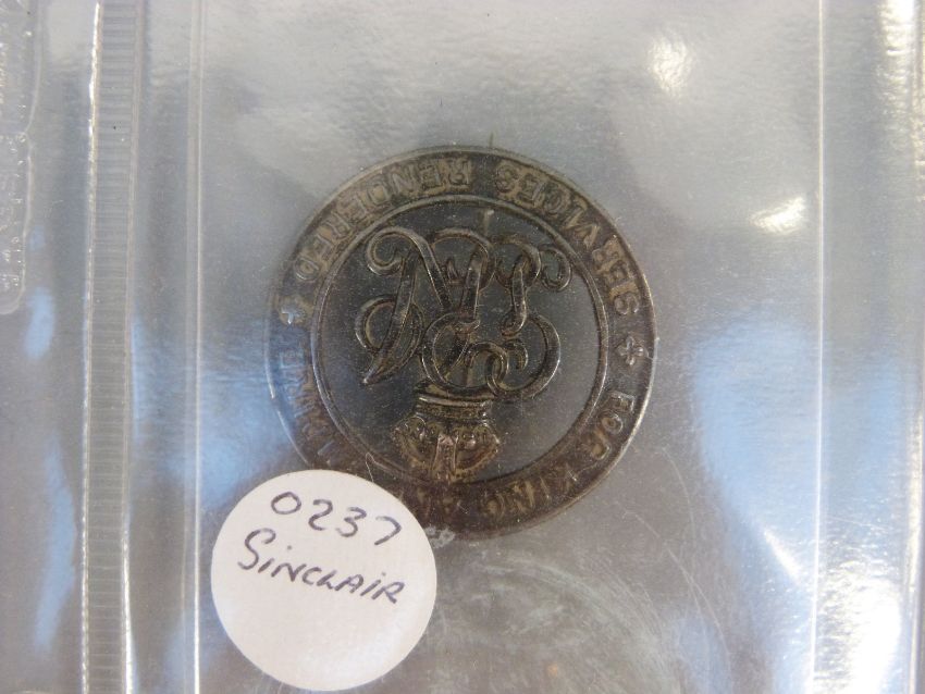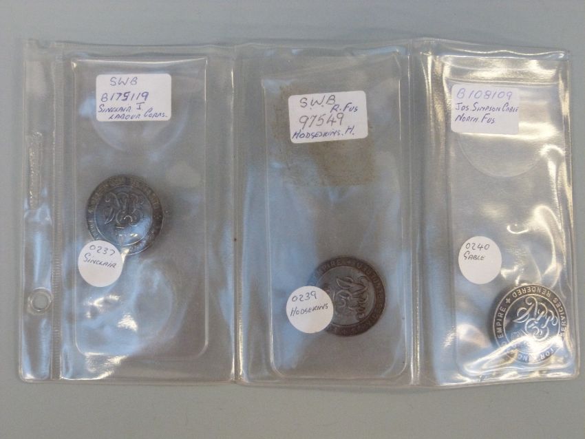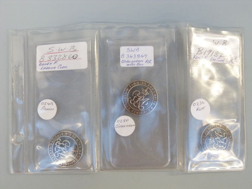 Three silver badges comprising SWB Roll B175119 499027 PTE John Sinclair Labour Corps; SWB Roll 97549 SPTS 594 PTE Henry Hodgekins RY FUS and B108109 25/873 PTE Jos Simpson Gable Norm Fus Depot