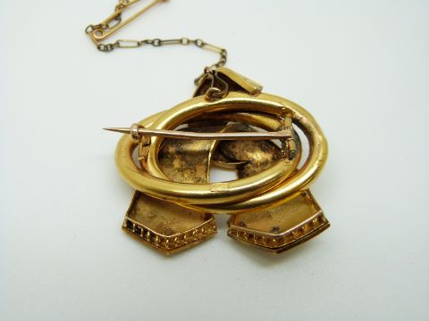 An 18ct gold Victorian brooch of knot design, set with seed pearls and blue enamel, 4 x 3.6cm