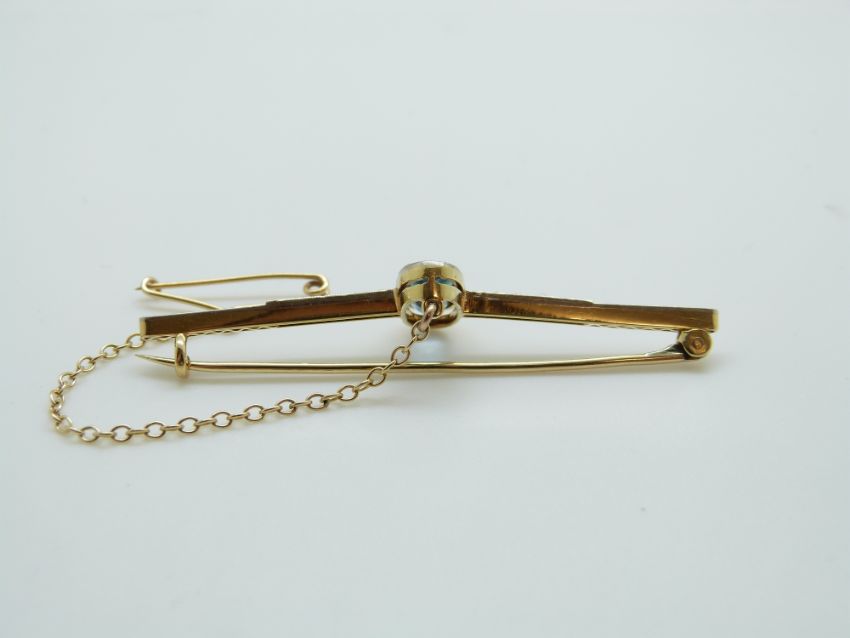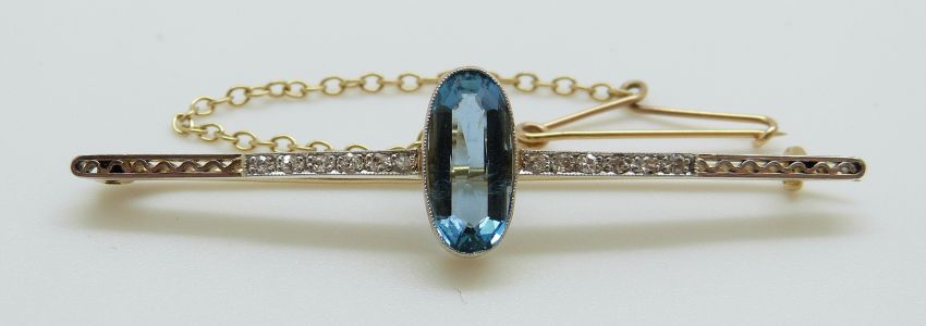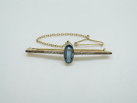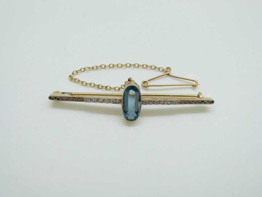 A 15ct gold brooch set with an oval cut aquamarine and diamonds with a platinum finish 5.6cm , 4.3g