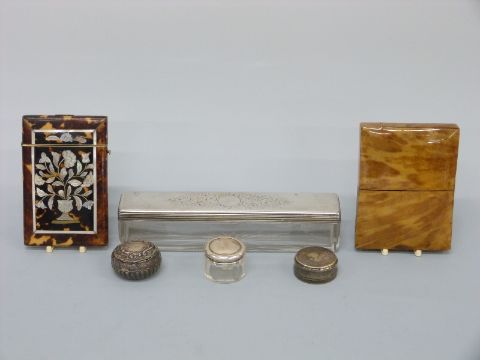 A long Victorian hallmarked silver lidded dressing table box, length 18cm, a small white metal trinket pot, two card cases etc