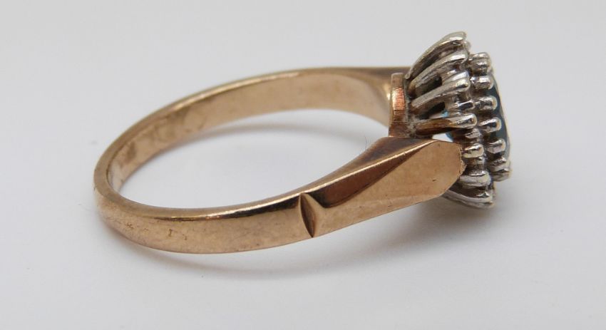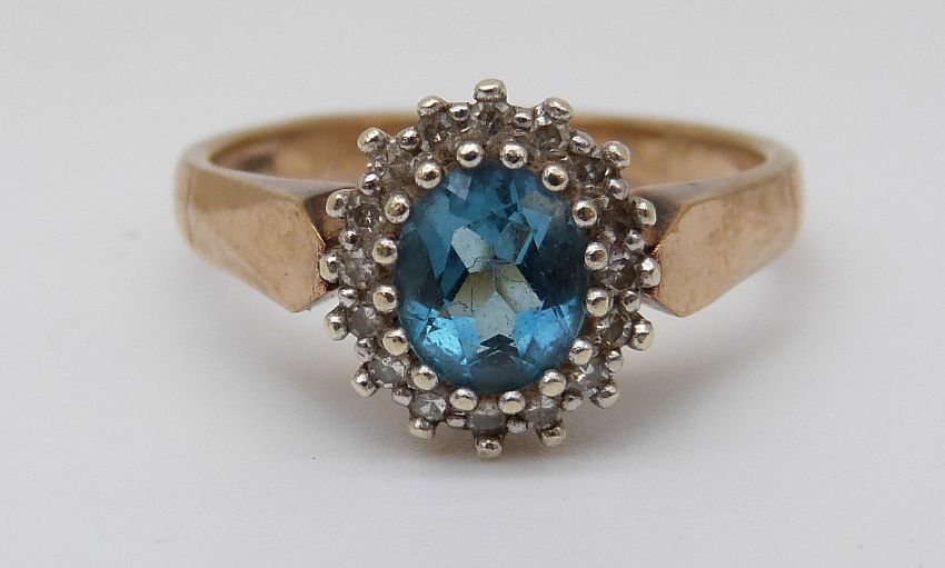 A 9ct gold ring set with blue topaz and diamonds (size J)