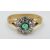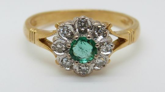A 9ct gold ring set with a round emerald surrounded by diamonds in a flower cluster (size L)