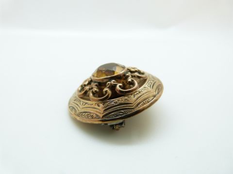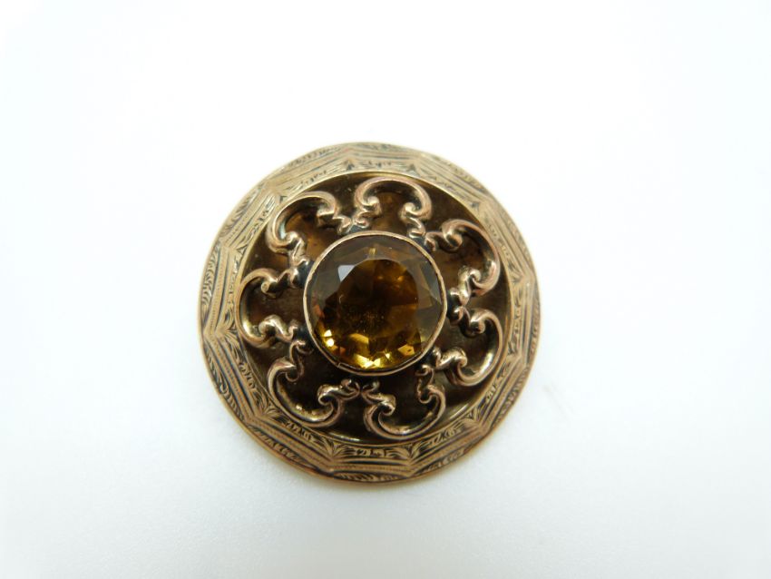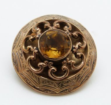 A Victorian brooch with engraved decoration and set with a citrine, 3.3cm, 9.1g