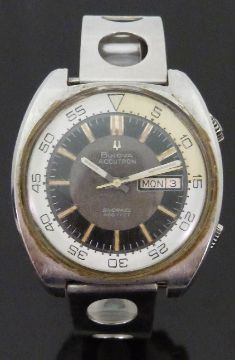 Bulova Accutron Snorkel 666 stainless steel gentleman's divers wristwatch with day and date aperture, Arabic numerals, baton markers and three-tone black, white and grey face, in stainless steel bracelet, case diameter 41mm, in original box