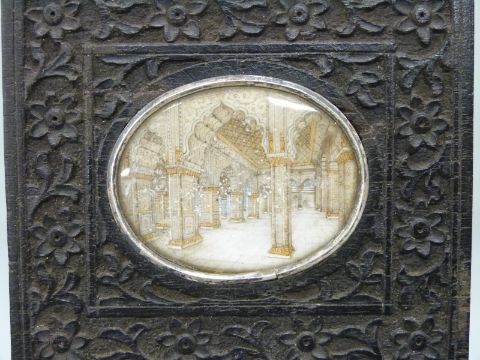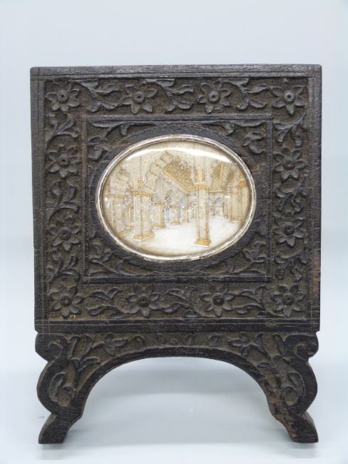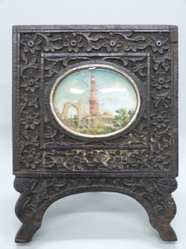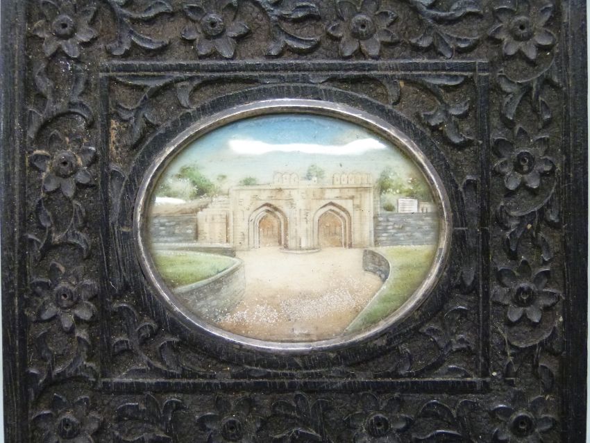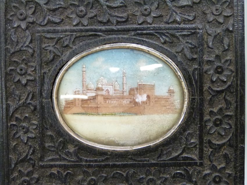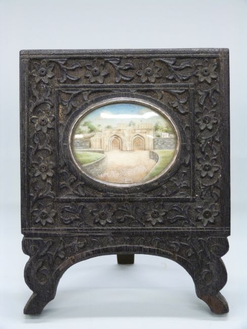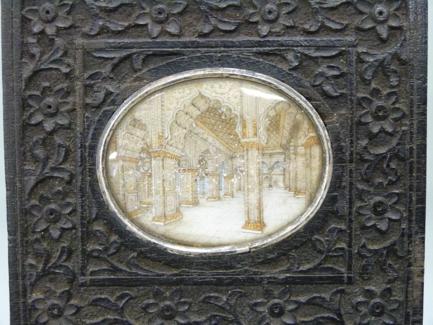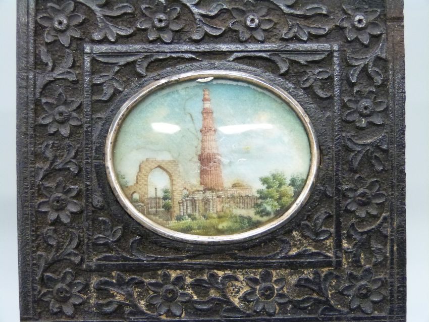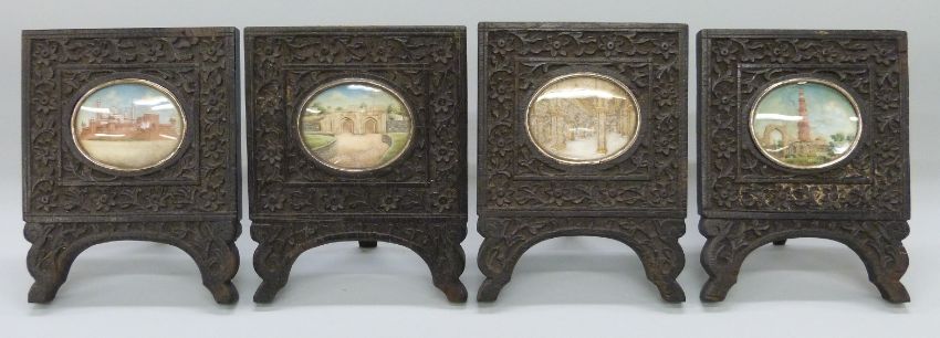 A set of four early 20thC Anglo Indian miniatures on ivory of the Taj Mahal and other scenes, in carved ebony frames, each approximately 12.5cm in length including frames