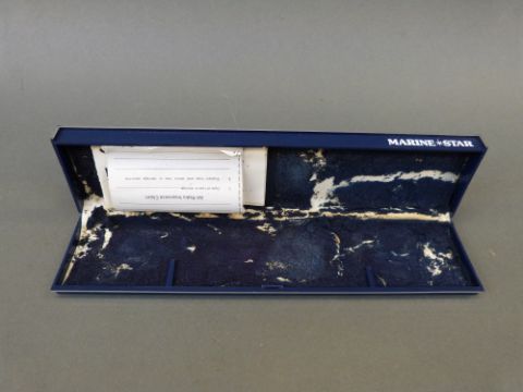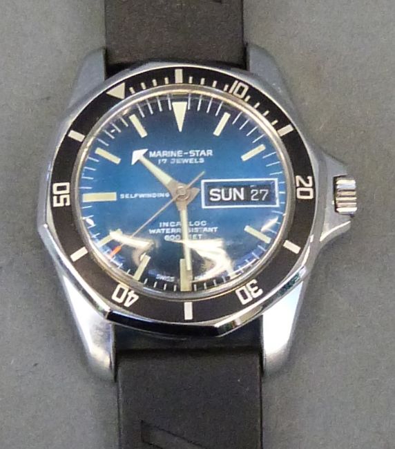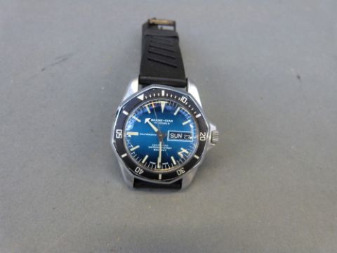 Marine-Star gentleman's automatic diver's wristwatch with day and date aperture, luminous hands and numerals, and graduated blue face, on rubber strap, case diameter 38mm, in original box.