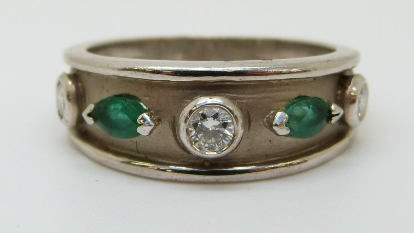 A 9ct white gold ring set with diamonds and emeralds (size O)
