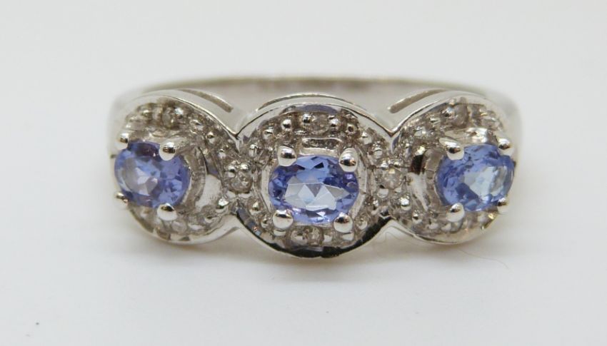 An 18ct white gold ring set with three oval cut tanzanite and diamonds (size N)