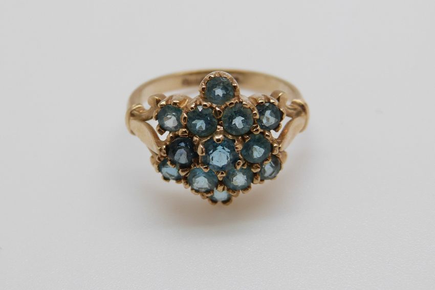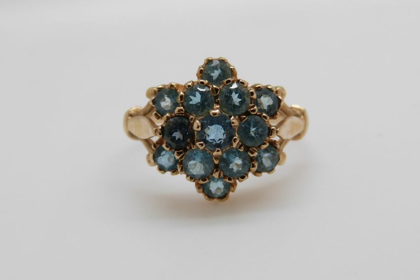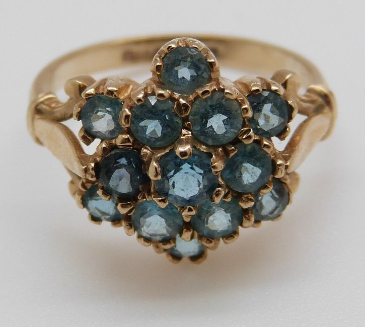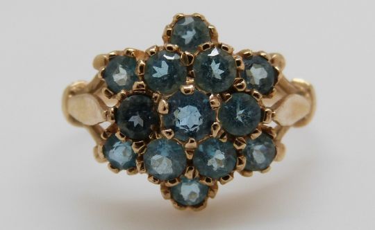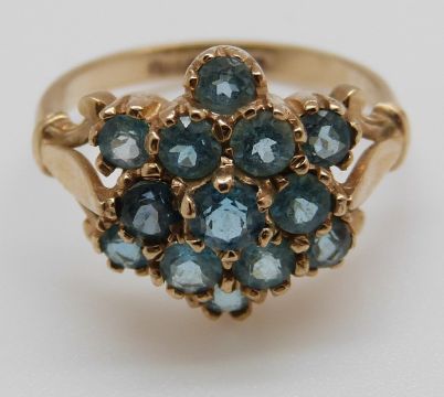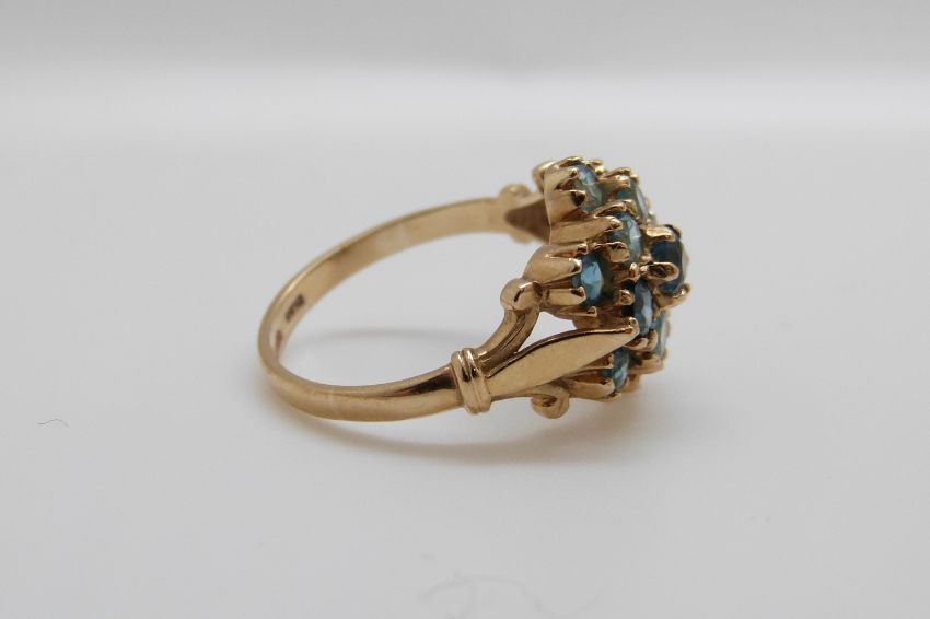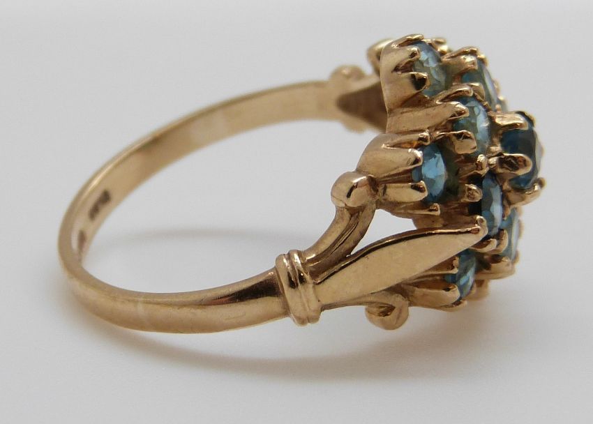 A 9ct gold ring set with blue topaz in a cluster (size N)