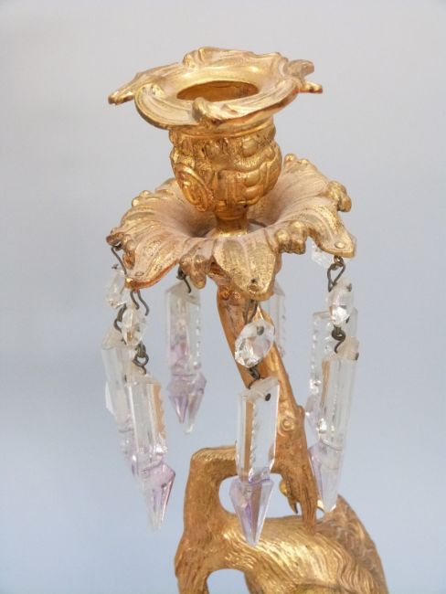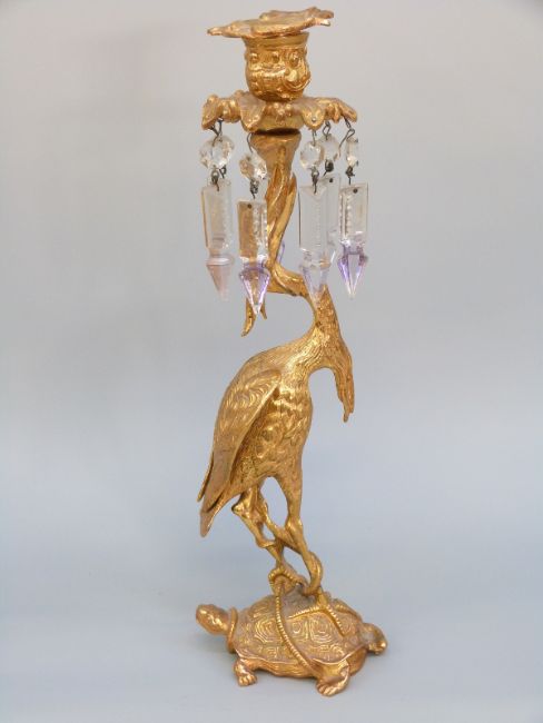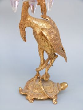 A pair of 19thC gilt bronze candelabra in the form of cranes on turtles in the Japanese style, possibly French, with cut glass drops, approximately 24.5cm tall