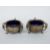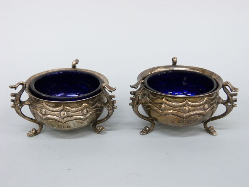 A pair of Edward VII hallmarked silver open salts with blue glass liners, on raised hoofed feet, London 1905 maker's mark rubbed, diameter 7cm, weight of silver 97g