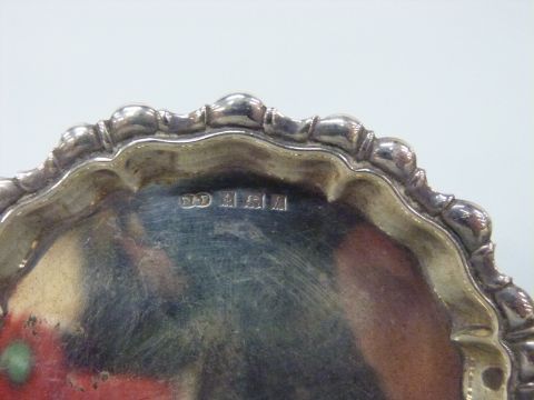 Five pieces of silver to include three pepper pots, open salt and miniature salver, diameter 8.5cm, weight 172g