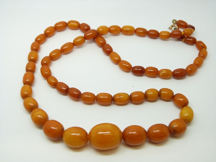 An amber necklace of 60 graduated ovoid egg yolk coloured beads, the largest approximately 20x15mm, with yellow metal clasp, 24g, 64cm long.