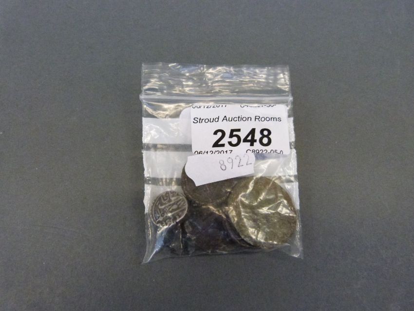A cache of ancient coins to include Roman etc, and a Middle Eastern silver example, seven in all, largest 27mm