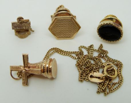A 9ct gold necklace, 9ct gold tie pin and a 9ct gold charm (5.1g)