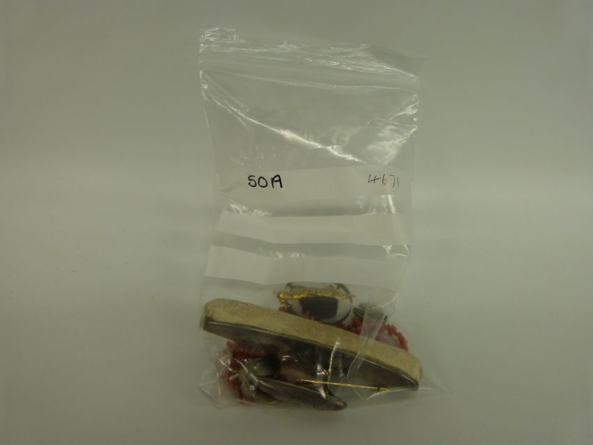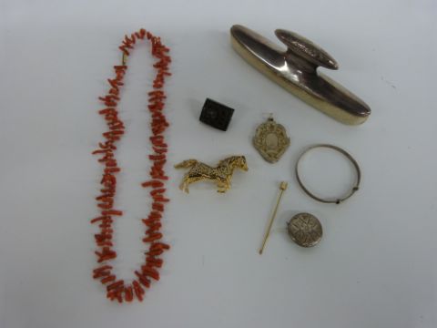 A carved jet brooch, silver mounted buffer, Victorian button, coral necklace, silver christening bracelet etc