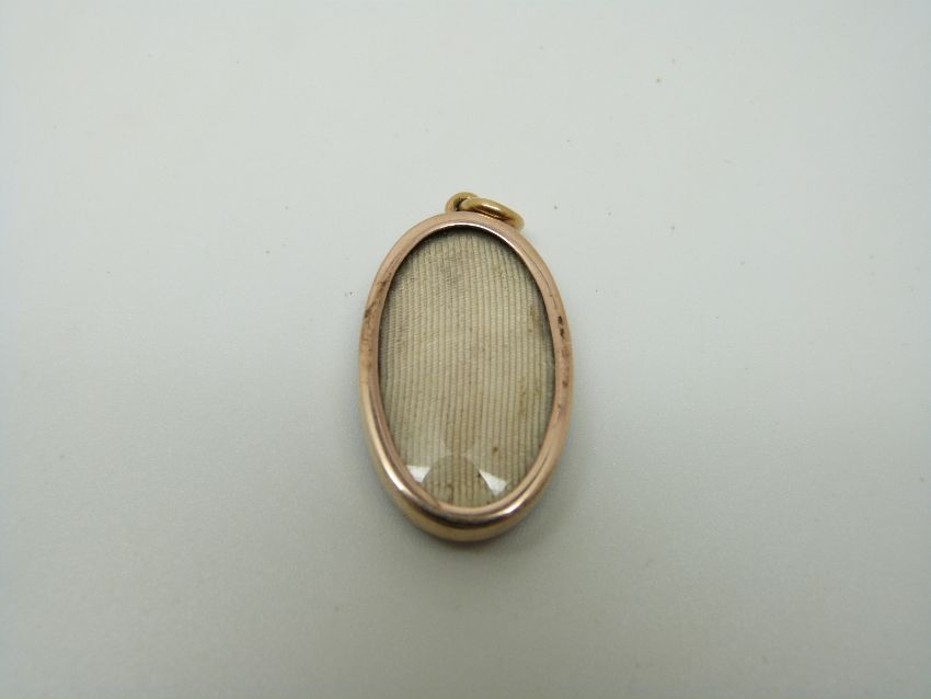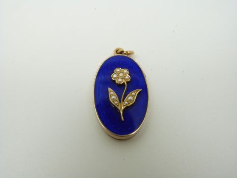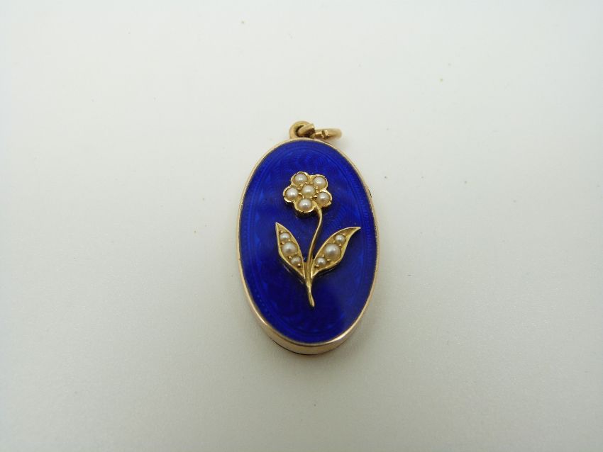 A Victorian oval pendant, the guilloché enamel ground with flower to the centre set with seed pearls, verso a glass compartment, 2.5 x 1.5cm