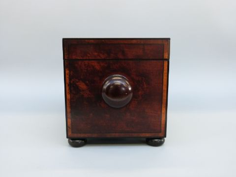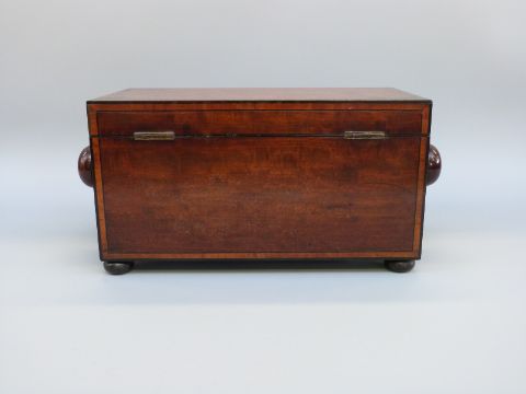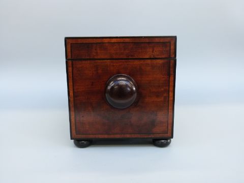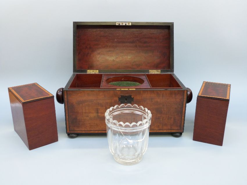 An early 19thC mahogany tea caddy of rectangular form with inlaid ebony detail, raised on bun feet, with fitted interior with two caddies and glass mixing bowl, H18 x W42cm