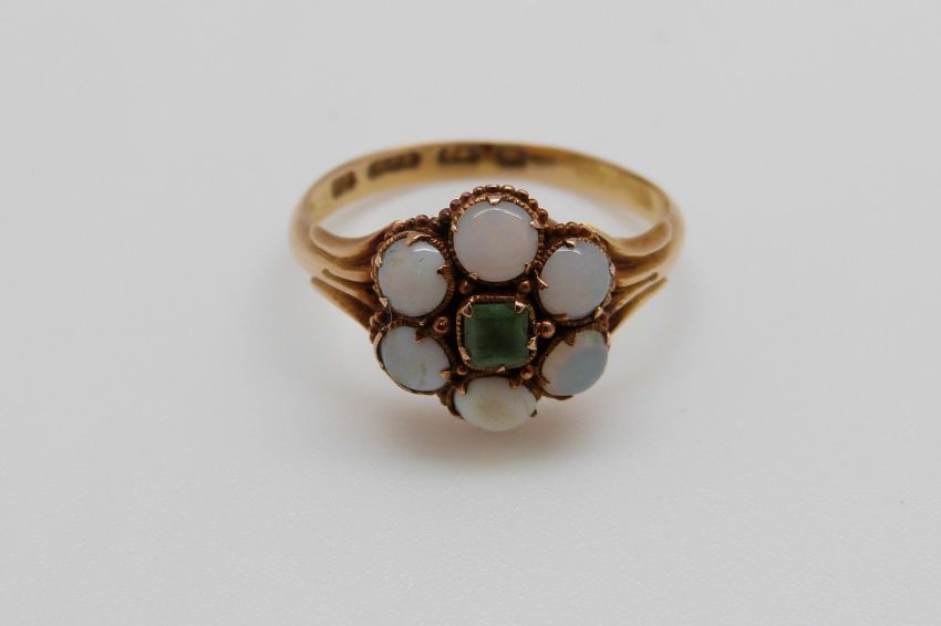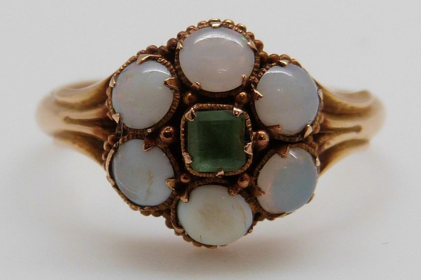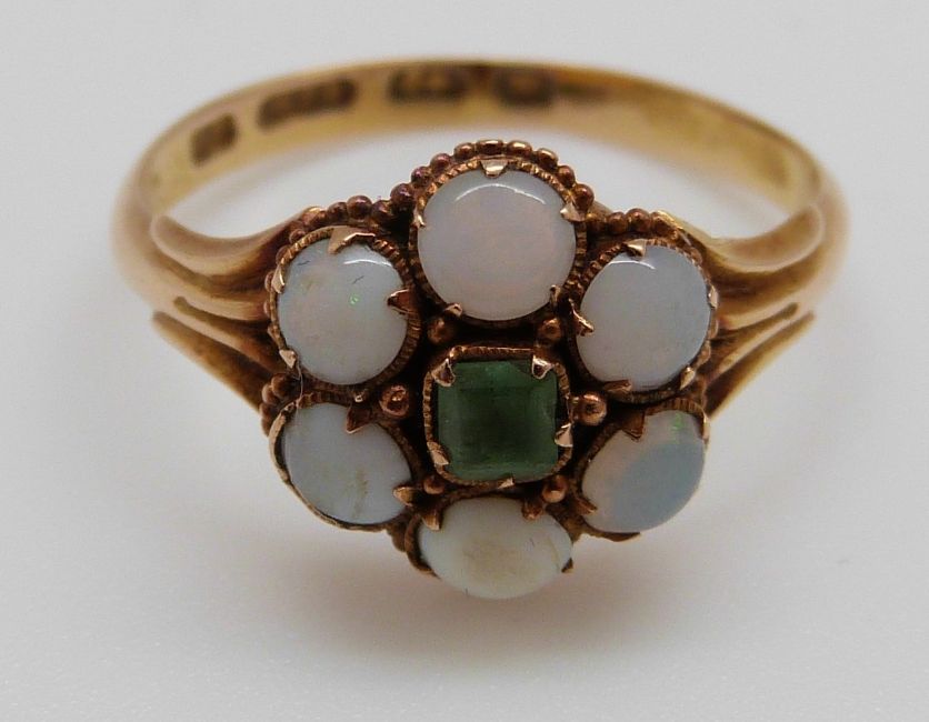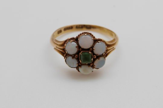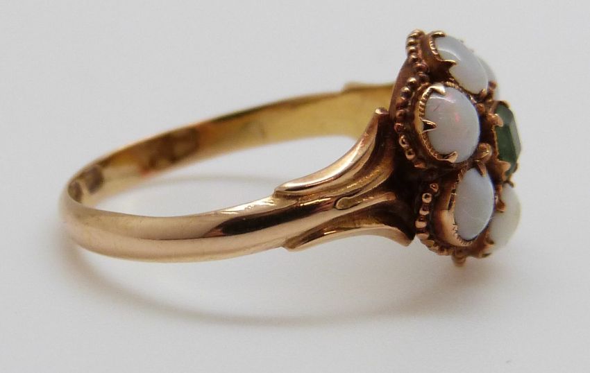 A Victorian 15ct gold ring set with a square cut peridot surrounded by opals (size M/N)