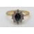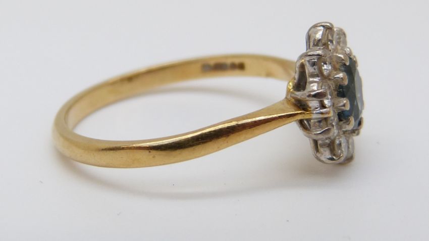 An 18ct gold ring set with an oval sapphire of approximately 0.35ct surrounded by diamonds, size M