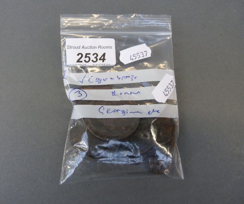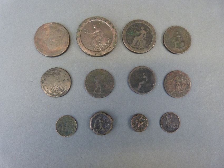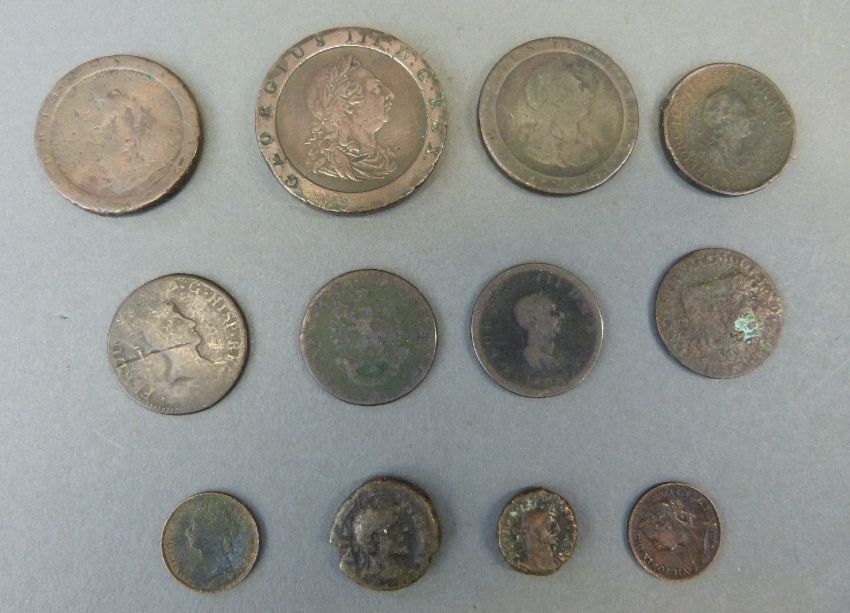 A cache of bronze and copper coinage to include two Roman examples, Georgian including cartwheel twopence, and two Conder halfpennies etc