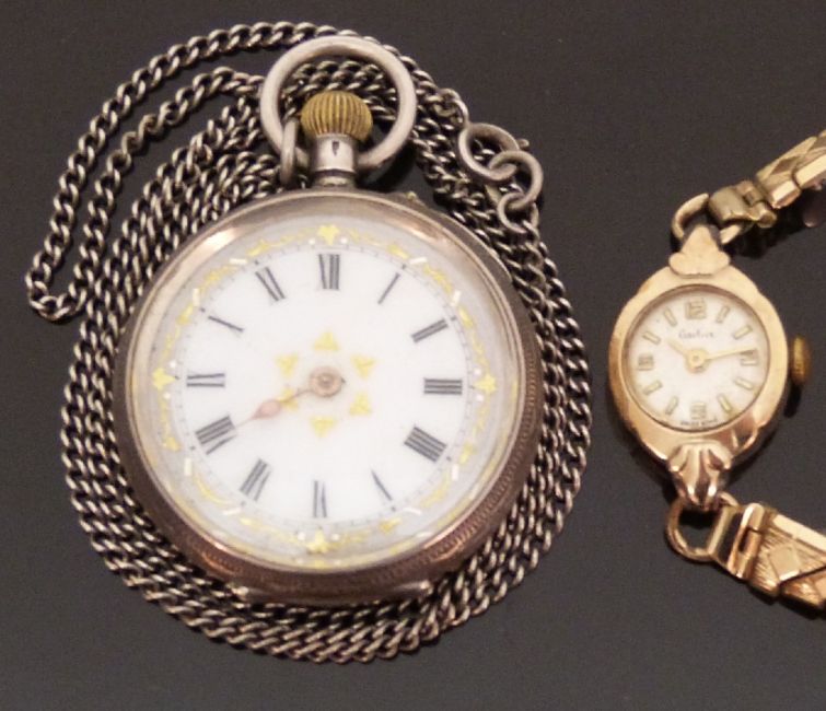 A hallmarked silver ladies keyless winding pocket watch with Roman numerals, gilt decoration and white enamel dial together with a 9ct gold ladies wristwatch.