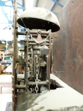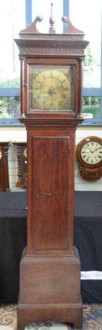 John Miles of Stroud (local interest) early to mid 19thC 30 hour duration oak longcased clock, the 11 inch brass Roman dial with Arabic minutes engraved with maker's name and simple foliate and geometric design, date aperture floral and foliate spandrels to corners and unmatched steel filigree hands. The case raised on bracket feet, the door with eight point star inlaid decoration, the carved hood with swan neck pediment and finial, columned corners with carved capitols, 229cm tall, including finial