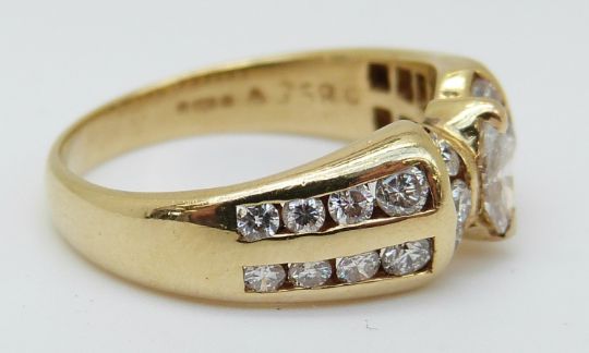 A 14ct gold ring set with a marquise cut diamond surrounded by round cut diamonds, 4.19g (size K)