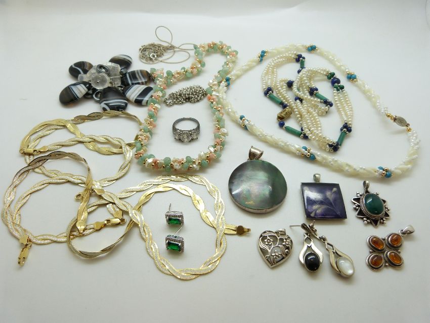 A collection of silver jewellery to include necklaces, bracelet, pendants, agate necklace, two pearl necklaces etc