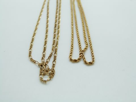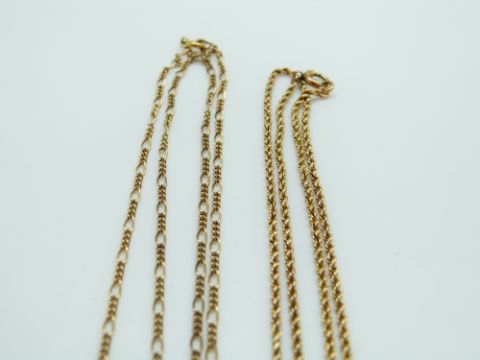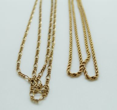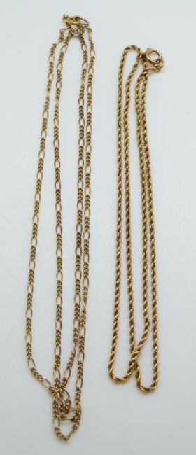 A 9ct gold rope twist necklace and a 9ct gold necklace, 9.1g, 49cm length, 1mm width