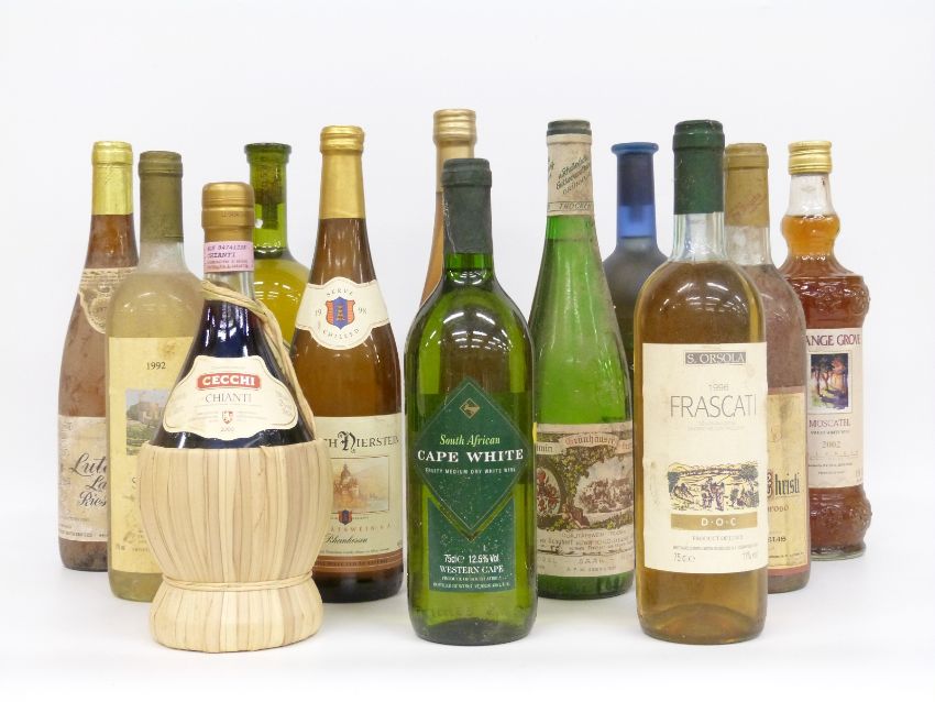 Twelve bottles of white wine and other alcohol to include 1975 Lutomer Laski Riesling, 1992 Soave, 2002 Orange Grove, 2000 Moscatel de Valencia, 2002 True Blue, 1998 Bereich Nierstein, 2000 Cecchi Chianti, 2003 Versus, 1996 Frascati, Lacrima Christi and Macrimin Grunhauser Herrenberg
