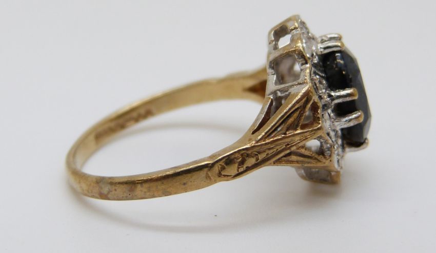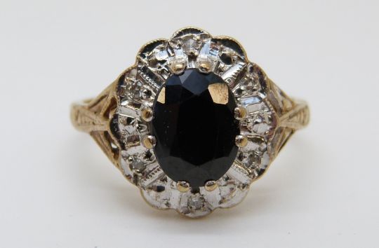 A 9ct gold ring set with a sapphire surrounded by diamonds (size L)