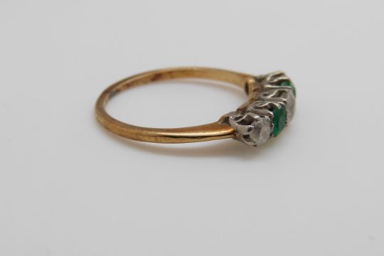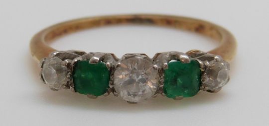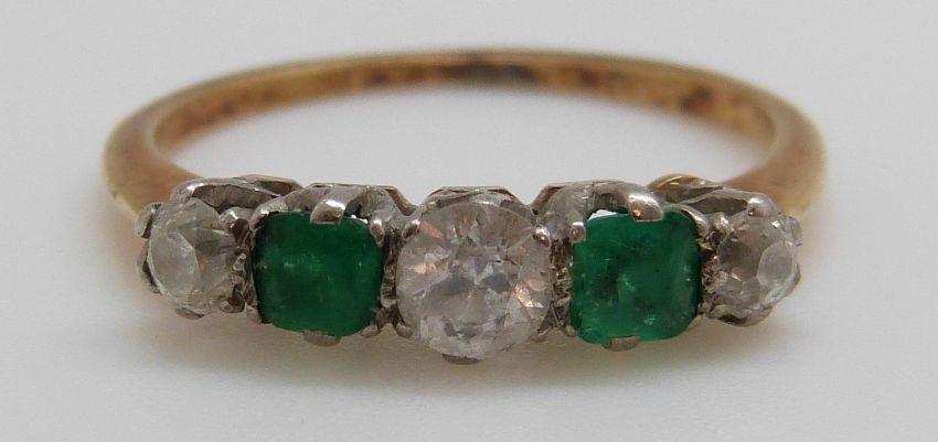 An 18ct gold ring set with three round cut diamonds and two square cut emeralds (size O)
