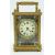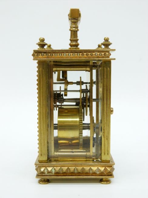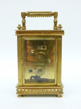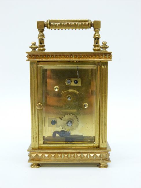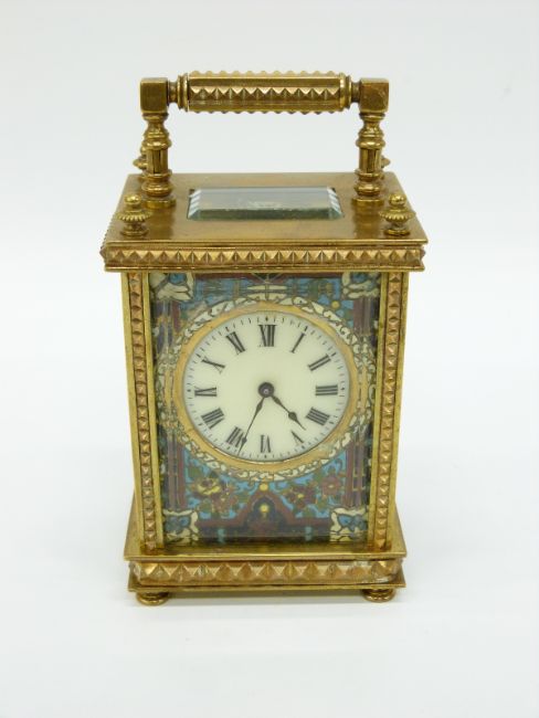 A circa early 20thC brass cased carriage clock, the ivory coloured enamelled Roman dial set in champlevé surround the brass case ornately decorated with raised pyramid decoration, on button bun feet, 9.5cm tall