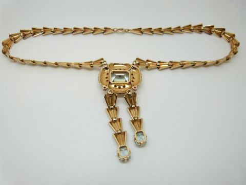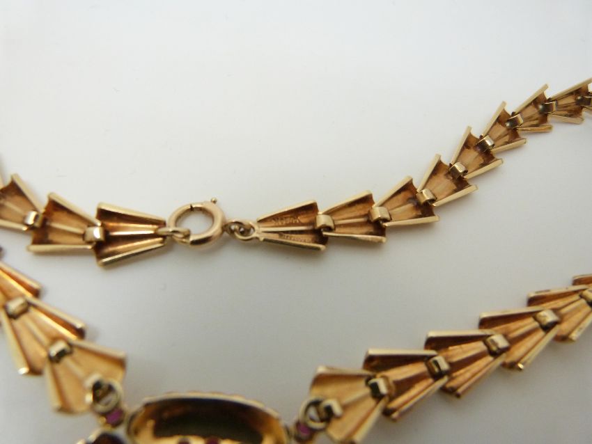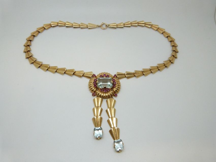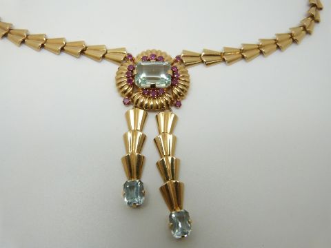A Tiffany & Co 14k gold necklace set with an emerald cut aquamarine measuring approximately 9ct surrounded by rubies with two further drop emerald cut aquamarines each approximately 1.8ct, 52.8g